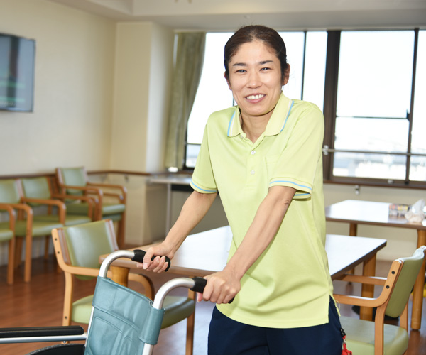 私が介護の仕事を目指したきっかけは、中学時代の夏休みに参加した特別養護老人ホームでのボランティア体験でした。祖父母がいなかったこともあり、ボランティアで利用者の方と触れ合う中で、「自分も将来こんな仕事に就きたい」と強く思いました。その後、高校、専門学校で福祉を学び、2006年に入職して以来、介護老人保健施設かにえの介護福祉士として働いています。